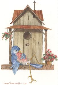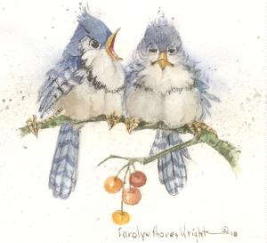 My Mom always dearly loved her Carolyn Shores Wright “Bird Life” with the bluebird at the bottom of a three bird image. After she passed away, we hung it in our home to honor her, as well as to continue to enjoy the priceless expressions on the faces of the birds.